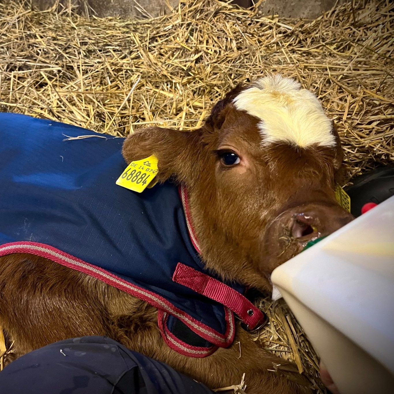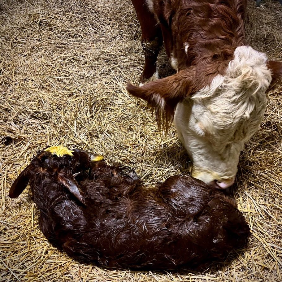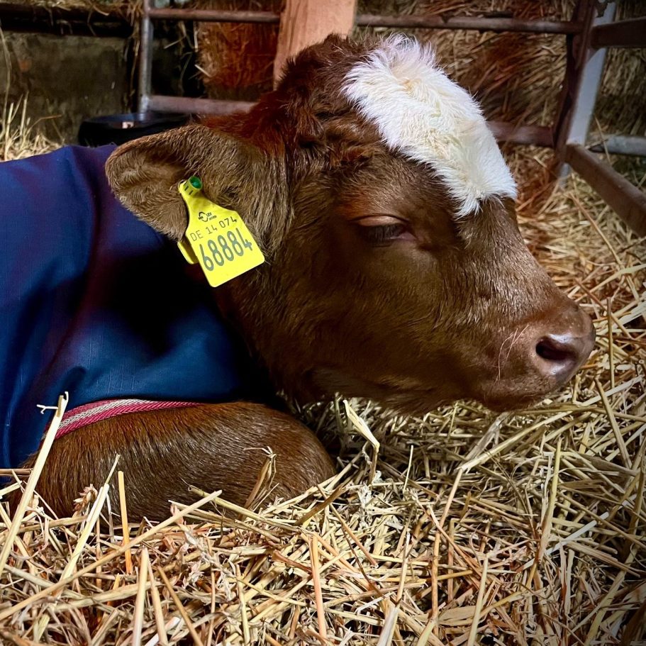 Unser Bullenkalb Friedrich wurde am 16.12.2025 als Schwergeburt geboren. Aufgrund seiner Größe und einer komplizierten Lage kam er nur mit menschlicher Hilfe zur Welt. Kurz nach der Geburt mussten wir seine Mutter Mia wegen schweren inneren Verletzungen einschläfern. Mia war unsere erste Mutterkuh und die treueste Seele unseres Betriebs – der Abschied fiel uns unendlich schwer.